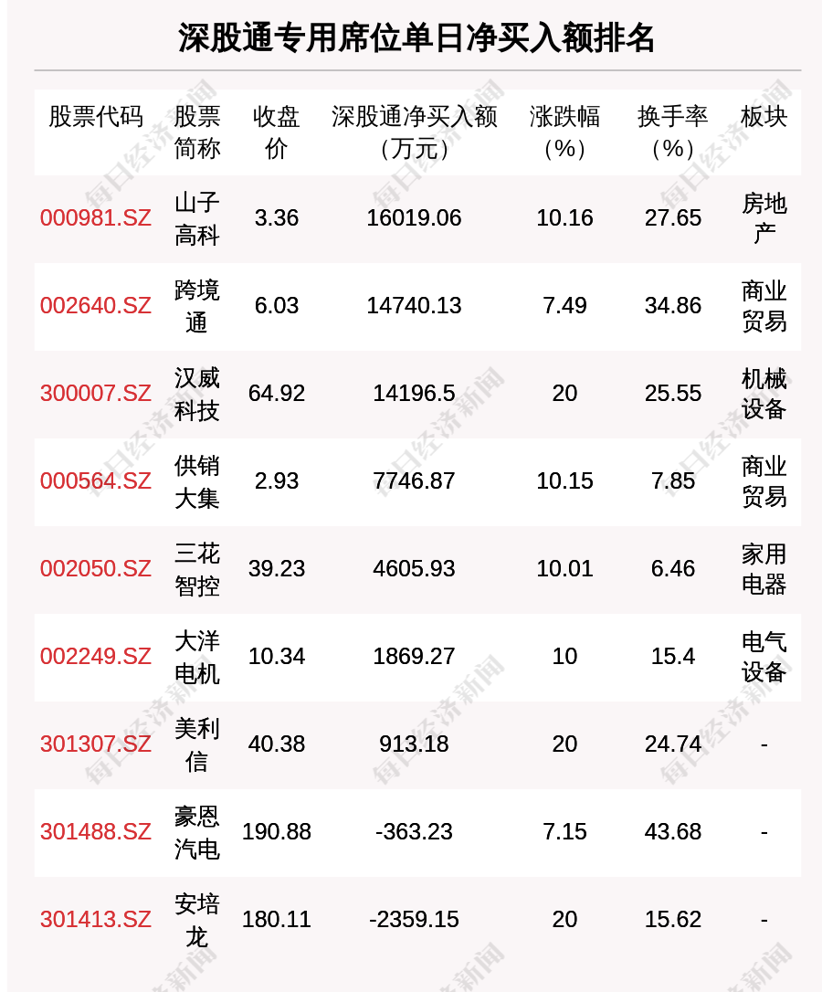 在龍虎榜中,涉及深股通專用席位的個股有9只,山子高科的深股通專用席位凈買入額最大,凈買入1.6億元。