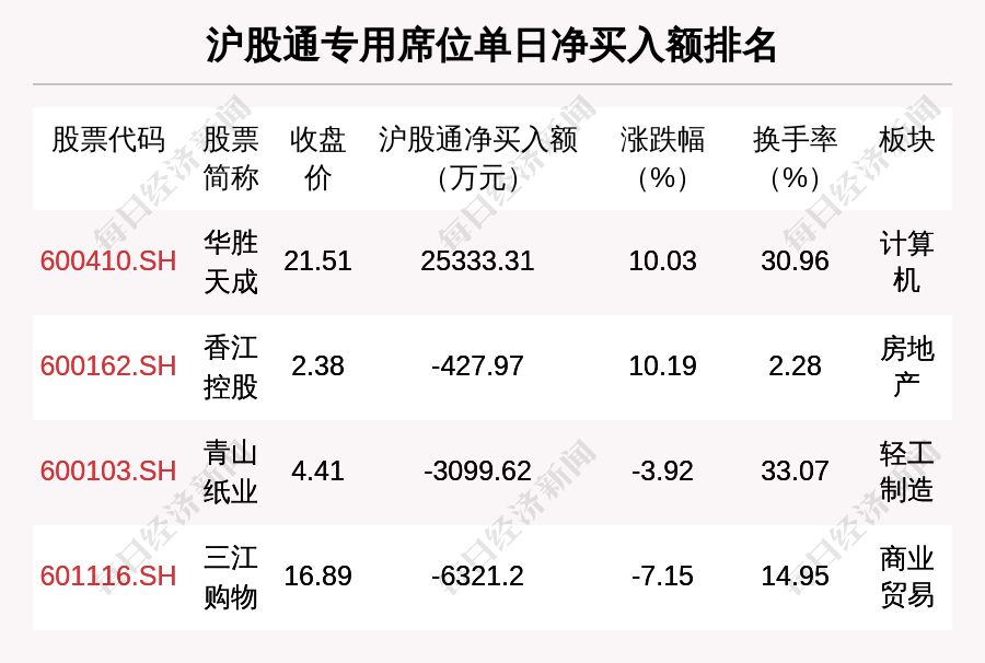 在龍虎榜中,涉及滬股通專用席位的個股有4只,華勝天成的滬股通專用席位凈買入額最大,凈買入2.53億元。