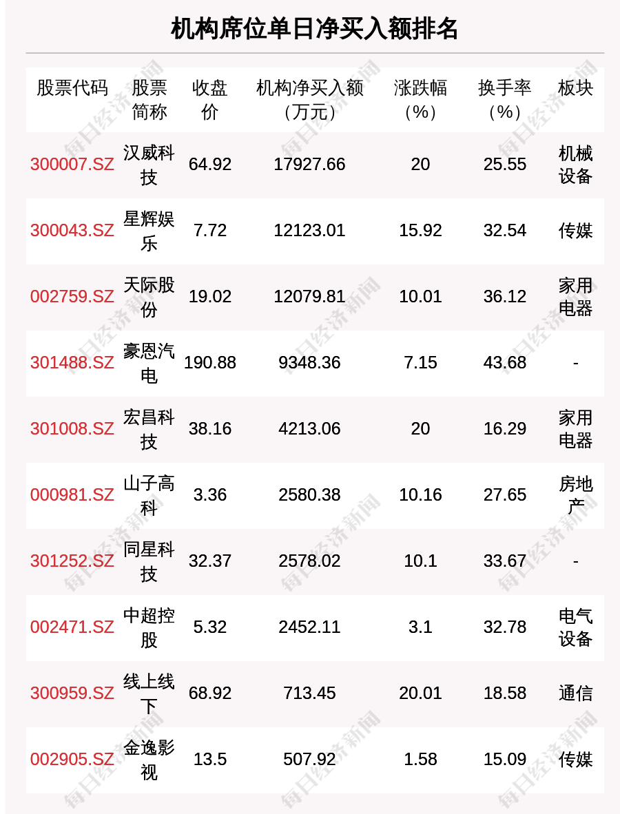 在龍虎榜中,涉及機構(gòu)專用席位的個股有21只,凈買入額前三的是漢威科技、星輝娛樂、天際股份,分別為1.79億元、1.21億元、1.21億元。