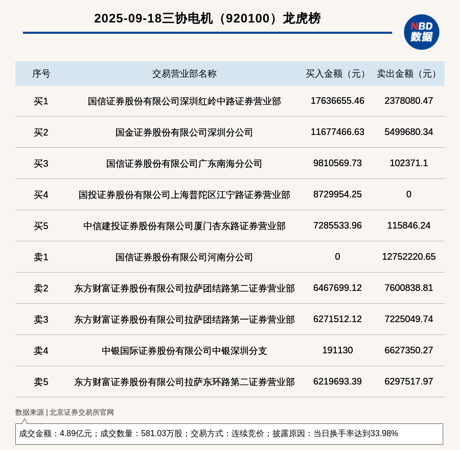 每經(jīng)訊,2025年9月18日,北交所上市公司三協(xié)電機(920100,收盤價:82.37元)登上龍虎榜,交易方式是連續(xù)競價,披露原因是當日換手率達到33.98%,成交數(shù)量581.03萬股,成交金額4.89億元。買一席位為國信證券股份有限公司深圳紅嶺中路證券營業(yè)部,買入1763.67萬元;賣一席位為國信證券股份有限公司河南分公司,賣出1275.22萬元。