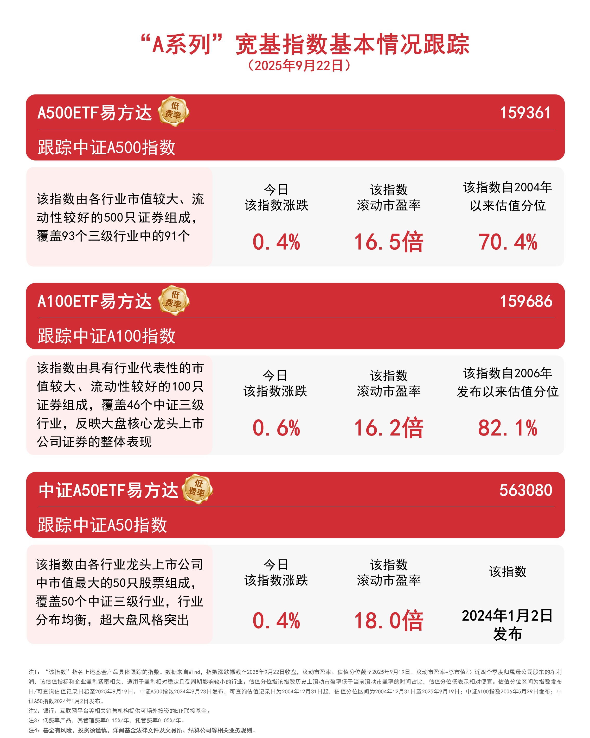 截至收盤,中證A500指數(shù)、中證A50指數(shù)均上漲0.4%,中證A100指數(shù)上漲0.6%,A500ETF易方達(dá)(159361)全天成交額超30億元。