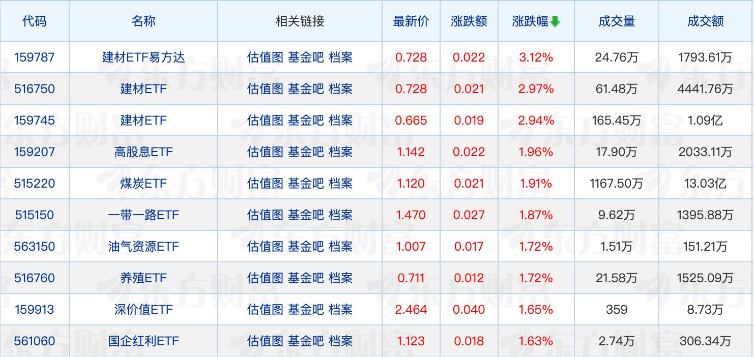 具體來看,建材相關(guān)ETF走強,最高漲3.12%。