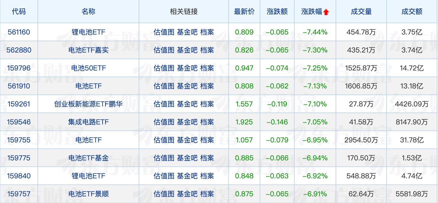 下跌方面,鋰電池相關(guān)ETF全線回調(diào),最高下跌7.44%。