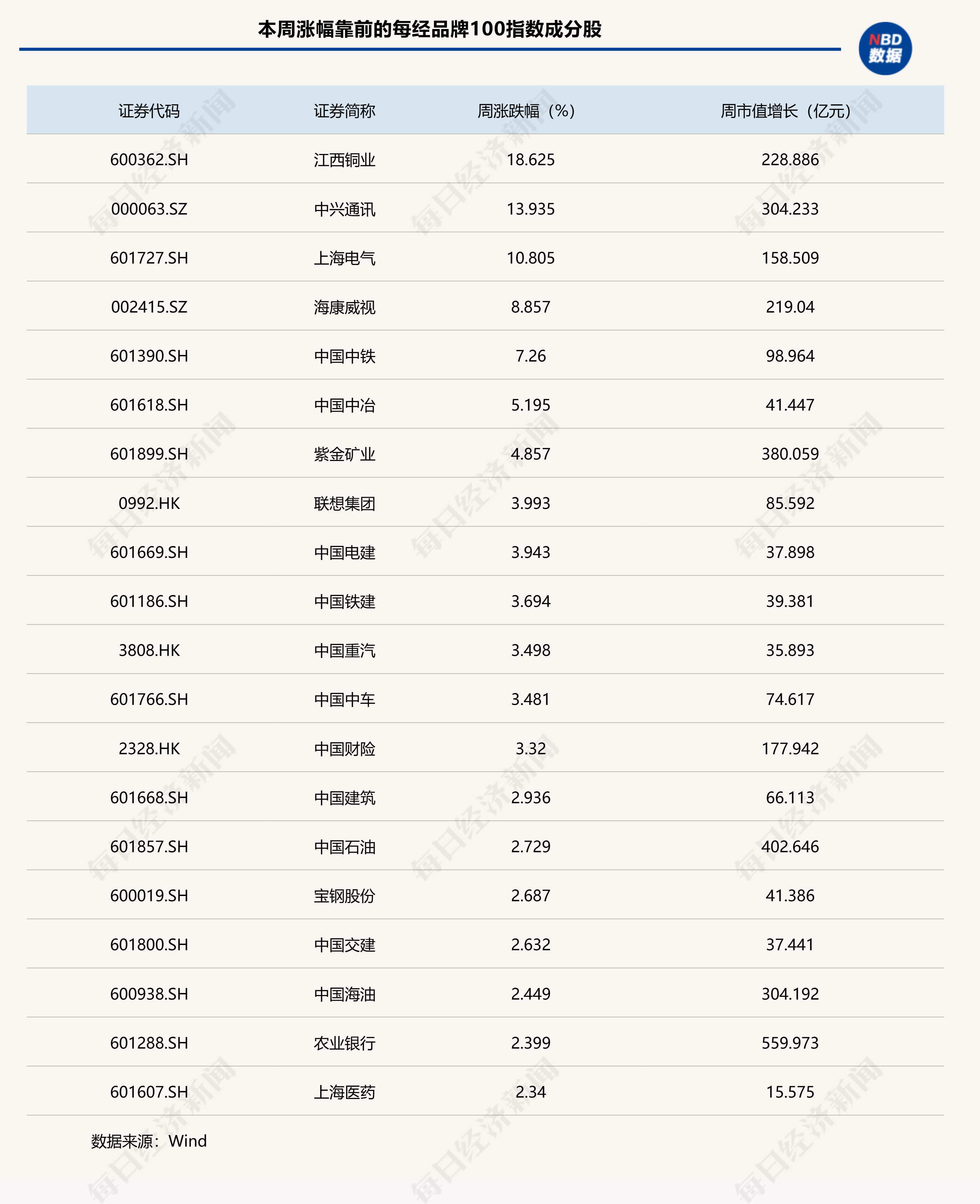 成分股走勢方面,江西銅業(yè)周漲幅達(dá)18.63%,表現(xiàn)最佳;中興通訊和上海電氣周漲幅也分別達(dá)到13.94%和10.81%,漲幅同樣靠前;??低暋⒅袊需F以及中國中冶周漲幅達(dá)到5%以上。此外,中國電建、中國中車、中國建筑等多只“中字頭”個股周漲幅也超過2%。