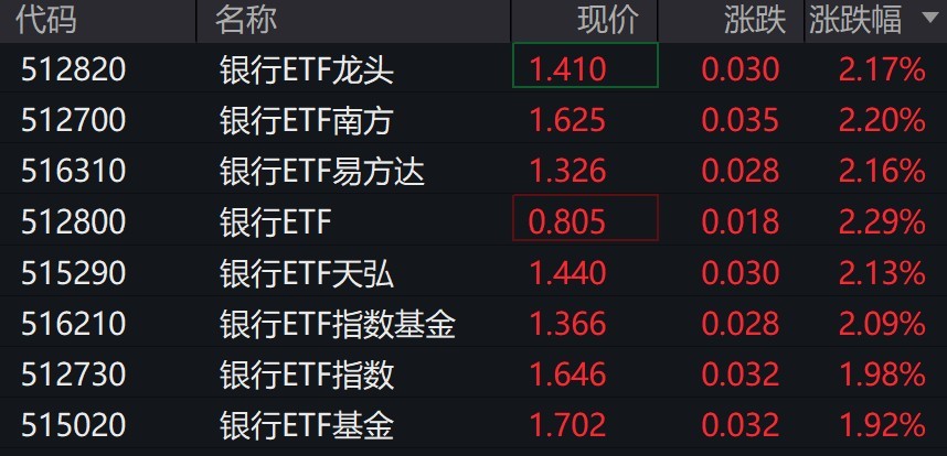 受盤面影響,多只銀行相關(guān)ETF漲超2%。