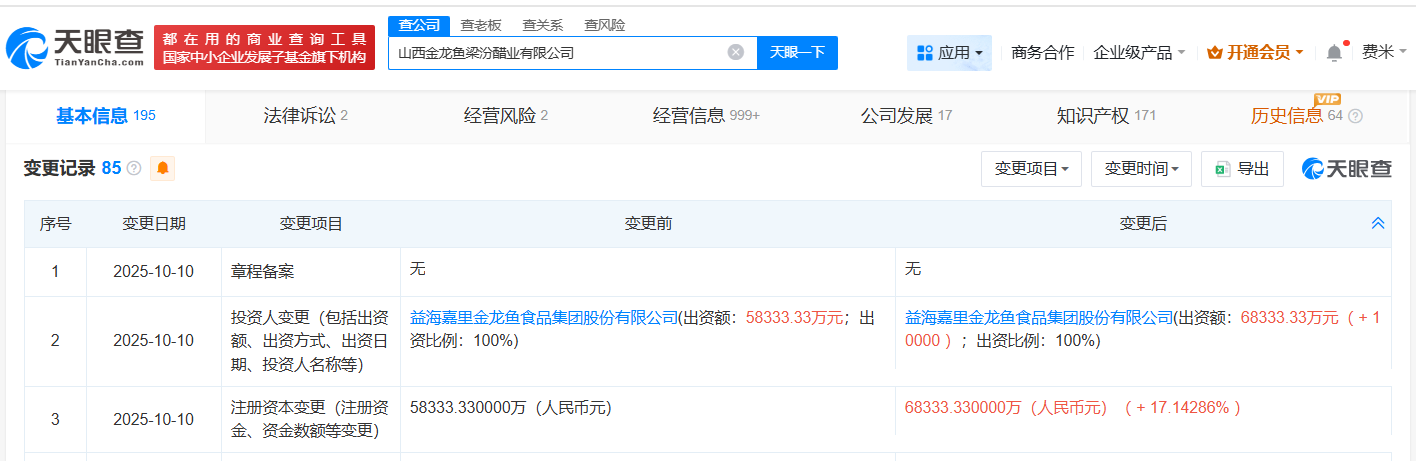 每經AI快訊,天眼查App顯示,近日,山西金龍魚梁汾醋業(yè)有限公司發(fā)生工商變更,注冊資本由約5.8億元增至約6.8億元,增幅約17%。該公司成立于2010年11月,法定代表人為張林,經營范圍包括食醋產品的研發(fā)、技術咨詢、技術服務等,由金龍魚(300999)全資持股。