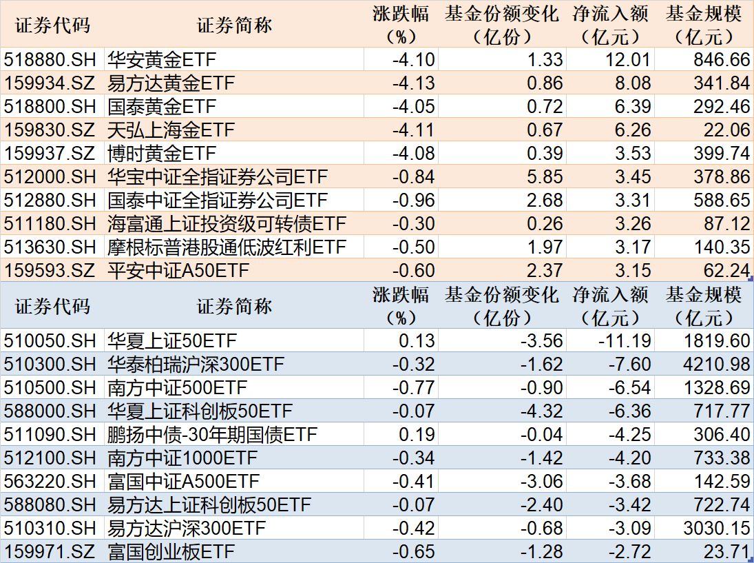 與此同時,華夏上證50ETF基金份額減少3.56億份,凈流出額為11.19億元;華泰柏瑞滬深300ETF基金份額減少1.62億份,凈流出額為7.60億元;南方中證500ETF基金份額減少0.90億份,凈流出額為6.54億元。