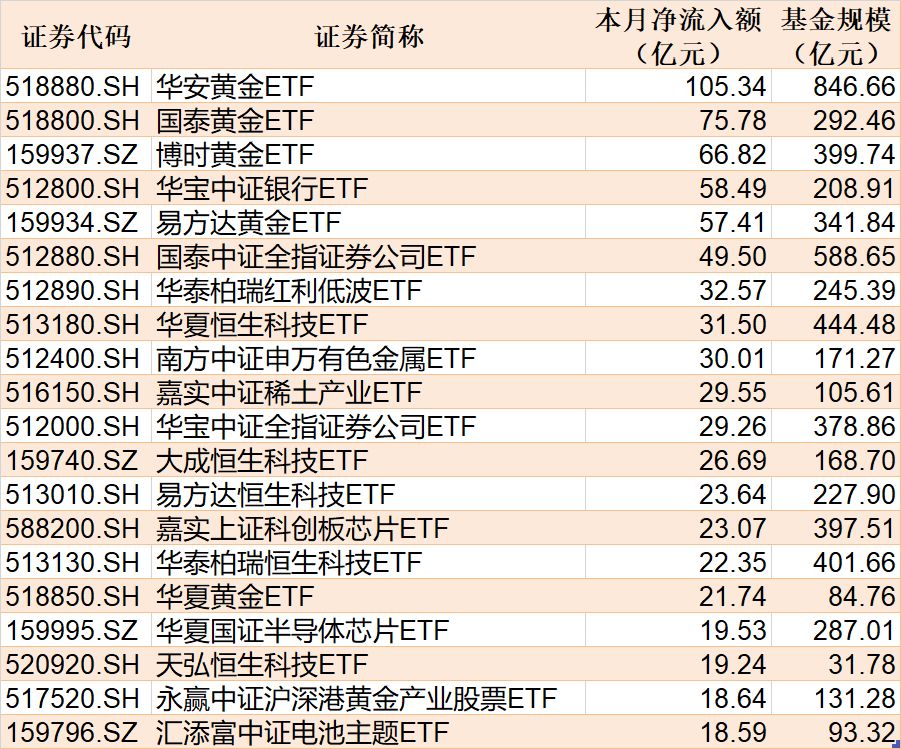 截至10月22日,本月資金凈流入額居前20的ETF名單如下: