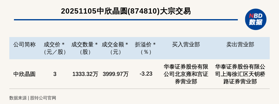 每經訊,2025年11月5日,新三板創(chuàng)新層公司中欣晶圓(874810,收盤價:3.1元)發(fā)生一筆大宗交易,成交價3元/股,成交數量1333.32萬股,成交金額3999.97萬元,折價3.23%。買入營業(yè)部是華泰證券股份有限公司北京雍和宮證券營業(yè)部,賣出營業(yè)部是華泰證券股份有限公司上海徐匯區(qū)天鑰橋路證券營業(yè)部。