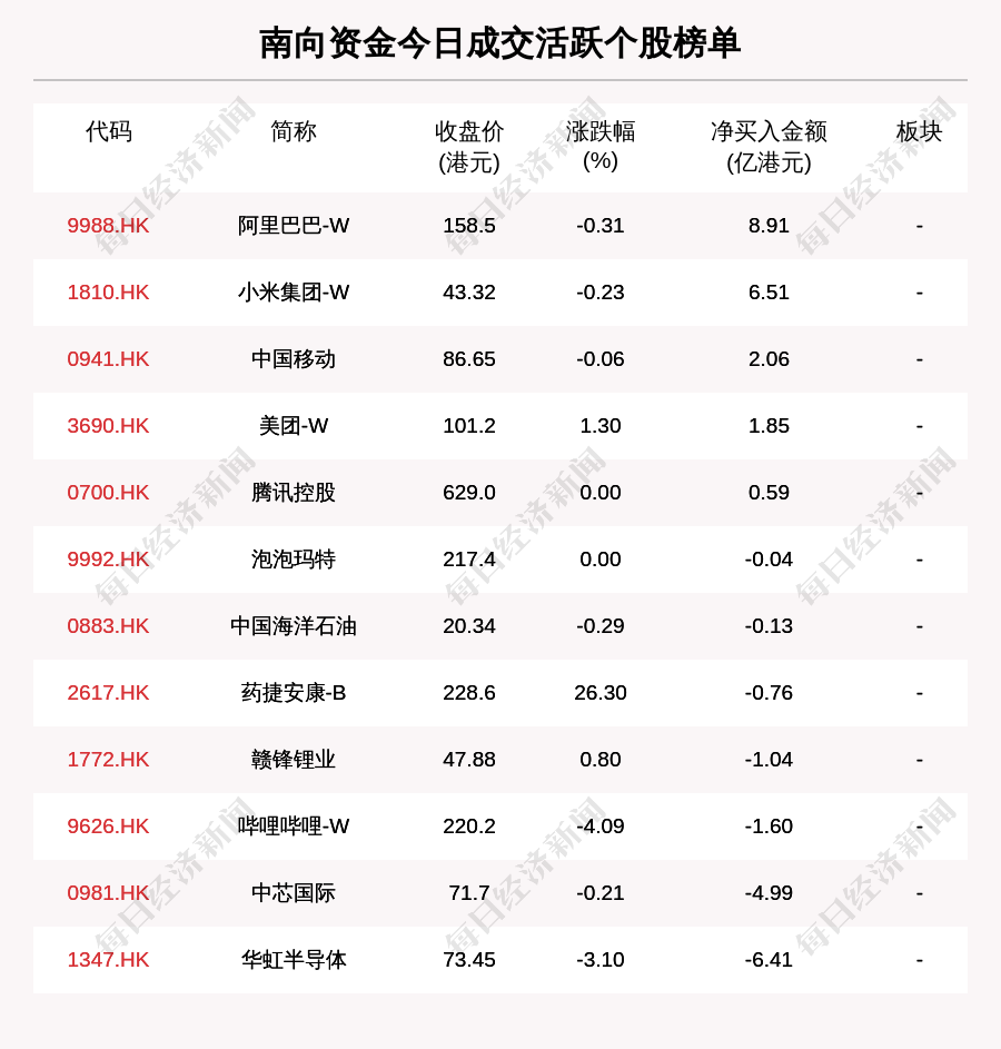 南向資金成交活躍個股榜單中,凈買入個股共5只,金額最多的是阿里巴巴-W(9988.HK,收盤價:158.5港元),凈買入8.906億港元;凈賣出個股共7只,金額最多的是華虹半導體(1347.HK,收盤價:73.45港元),凈賣出6.407億港元。