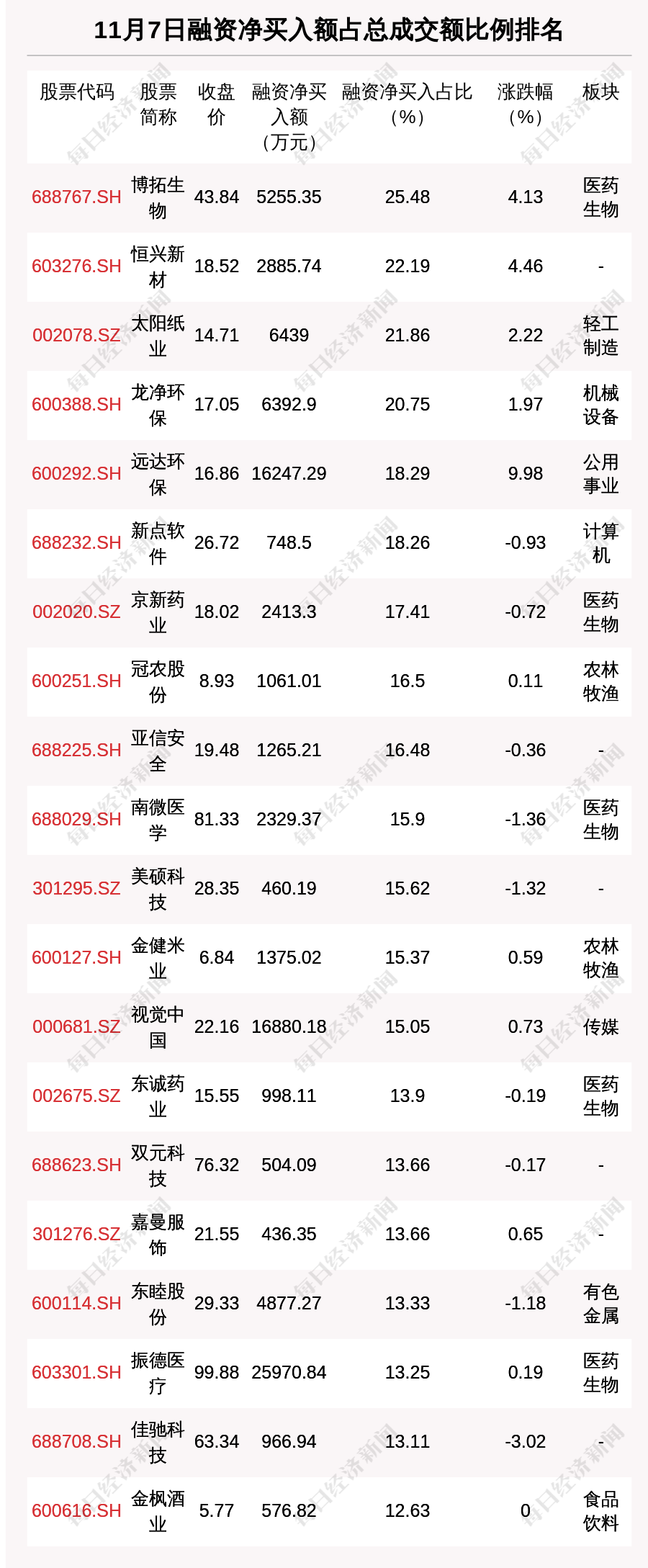 11月7日兩市共有1460只個(gè)股有融資資金凈買入。共有48只股票融資凈買入額占總成交金額比例超10%,其中博拓生物、恒興新材、太陽(yáng)紙業(yè)排名前三,占比分別為25.48%、22.19%、21.86%。