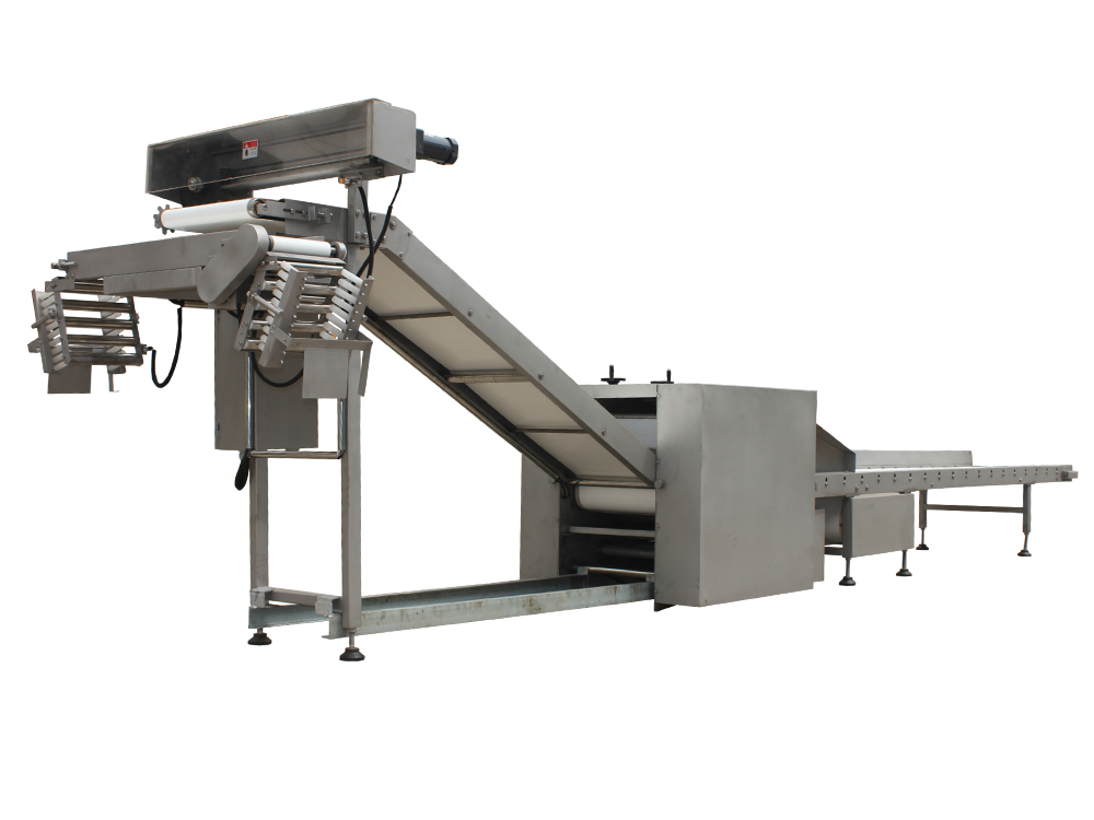 →軋面輸送分切機  →型號430/550型  →功能  軋面輸送分切機是用于將面團(tuán)或面片進(jìn)行軋制和輸送,并在特定位置進(jìn)行分切操作。通常與其他食品機械設(shè)備配合使用,如和面機、壓延機等,形成完整的生產(chǎn)線?!  厣 ?、通過智能觸控顯示屏,參數(shù)自由設(shè)定,自動化控制,能夠確保分切的準(zhǔn)確性和一致性,提高生產(chǎn)效率?! ?、不銹鋼壓輥間隙可調(diào)節(jié),適應(yīng)不同規(guī)格和厚度的面團(tuán)或面片,滿足不同生產(chǎn)需求?! ?、設(shè)備設(shè)計合理,結(jié)構(gòu)穩(wěn)定,能夠保證在長時間連續(xù)工作中保持穩(wěn)定的性能?! ?、主要應(yīng)用于饅頭、餃子皮、餛飩皮等面食制品的生產(chǎn)?! ?、壓輥采用不銹鋼材質(zhì),符合現(xiàn)行有關(guān)食品衛(wèi)生標(biāo)準(zhǔn)?! ?、可根據(jù)客戶需求定制。產(chǎn)品型號軋輥寬度(mm)高線速度(m/min)功率(kW)調(diào)速方式軋制生坯厚度(mm)外形尺寸長×寬×高(mm)YMS-430lll4307.13.7變頻調(diào)速40-1007348×1200×1103YMS-550lll5507.13.7變頻調(diào)速40-1007348×1320×1103